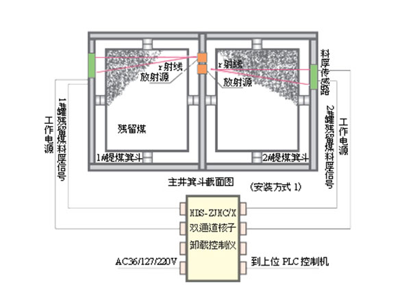 系統結構示意圖 系統設備組成由帶輻射輸出器、屏蔽罐的放射源;射線探測器和固定支架等構成殘留煤厚信號采集部分,由AC127V電源和本安24位單片機等構成控制主機,由本安固態繼電器版、 接線箱等構成料后信號輸出、輸出控制部分。其中放射源經國家環保部門檢測,符《GB4792-84》安全標準,不會對人體產生損傷,請用戶放心!系統工作原理簡述放射源輸出的γ射線穿透機斗鋼板和機斗內卸載后殘留煤,被射線探測器接收,轉換成電信號給控制主機。射線穿透鋼板和殘留煤層時要被部分吸收,被吸收的量與殘留煤層的厚度成一定的對應關系。探測器輸出的電信號強度與殘留煤層的厚度具有一一對應關系。控制儀主機通過檢測電信號的強度按一定的數學模型、公式,就可得出被測截面卸載殘留煤的厚度,并按設置上、下限值進行遠傳報警輸出。實用性及功能實現◇ 該系統可對主井箕斗卸載進行有效安全控制,以免箕斗重載下放或二次裝載的事故發生。◇ 控制主機可檢測箕斗被測載面卸載殘留煤的厚度值,按預設的上、下限報警值進行報警。◇ 給出上位主機PLC的殘留煤厚度報警值,為經繼電器隔離的干接點信號(常開或常閉)。